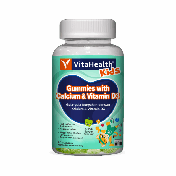 Top up your kids’ calcium intake with VitaHealth Kids Gummies with Calcium & Vitamin D3. Great for all growing children, these fun, apple-favoured gummies are enriched with vitamin D3 which helps promote the absorption and utilisation of calcium. Made in a great-tasting apple flavour kids love, these gummies are also free from lactose, common allergens, and preservatives. For added safety, each bottle comes with a child-proof cap.