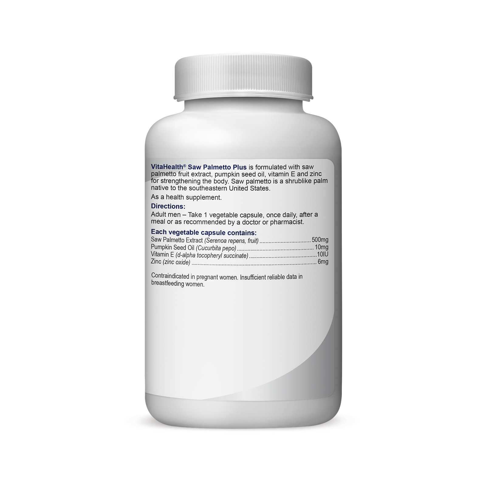 VitaHealth Saw Palmetto Plus is formulated with saw palmetto fruit extract, pumpkin seed oil, vitamin E and zinc.