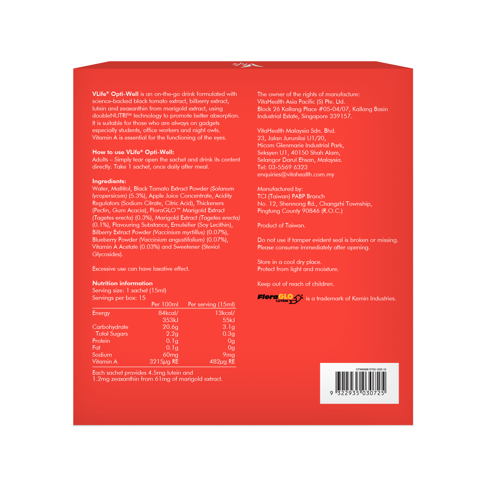 Black Tomato Extract, FloraGLO™ Marigold Extract (4.5mg Lutein), Marigold Extract (1.2mg Zeaxanthin), Bilberry extract, Blueberry powder, Vitamin A