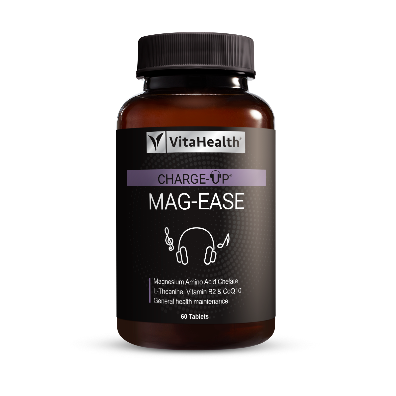VitaHealth Charge-Up Mag-Ease 结合了螯合镁与L-茶氨酸,维生素B2及辅酶Q10,以维持健康。